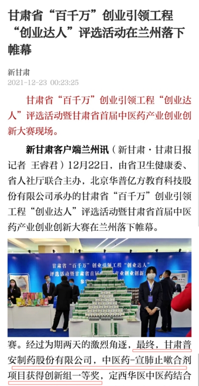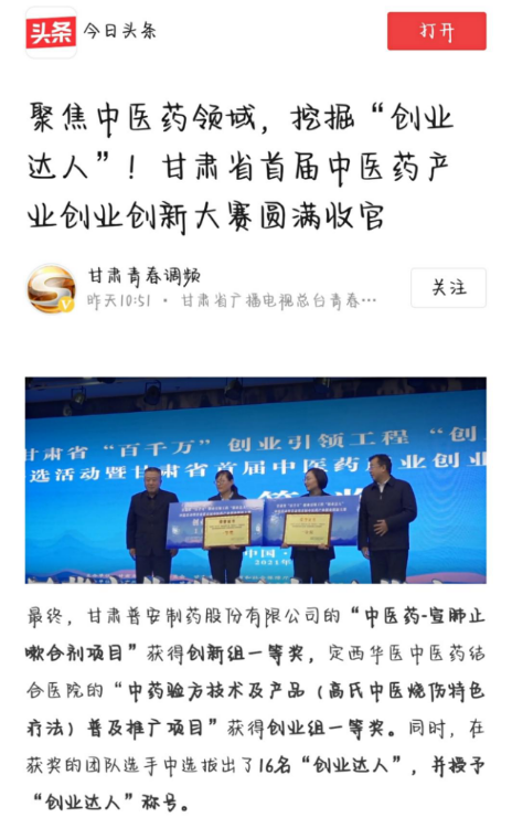多家媒體爭相報道,“甘肅普安制藥股份有限公司榮獲甘肅省首屆中醫(yī)藥產(chǎn)業(yè)創(chuàng)業(yè)創(chuàng)新大賽創(chuàng)新組第一”強勢霸屏