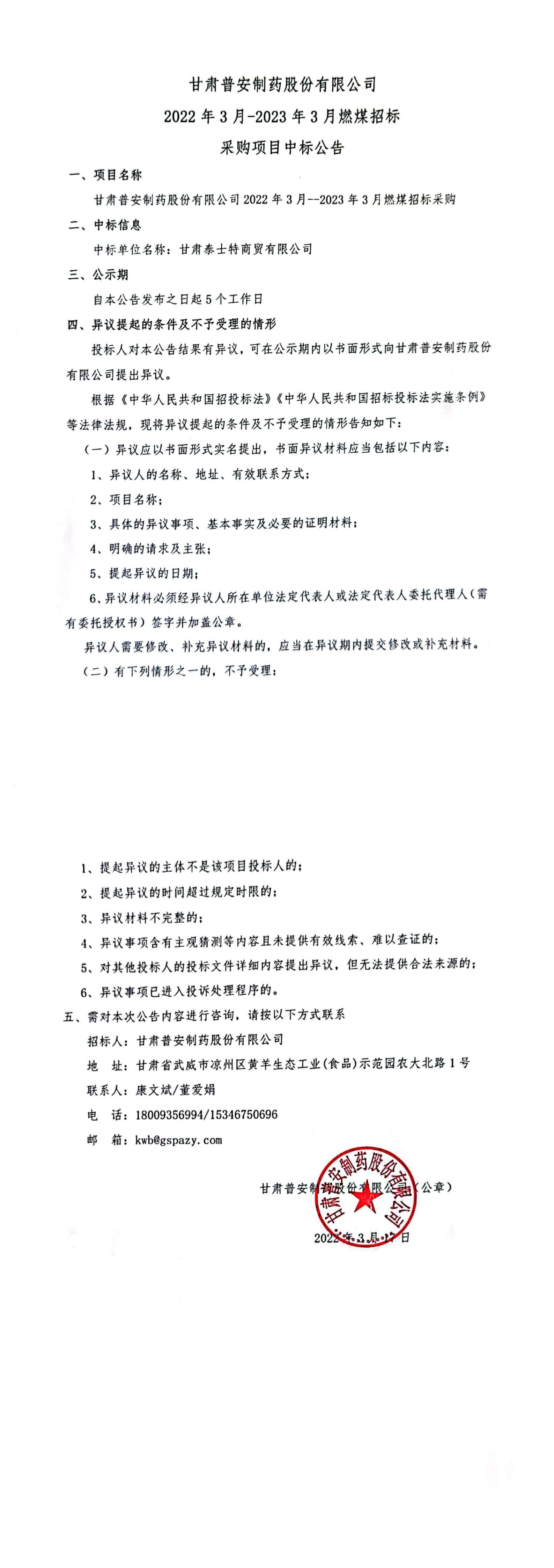 甘肅普安制藥股份有限公司2022年3月-2023年3月燃煤招標(biāo)采購項目中標(biāo)公告