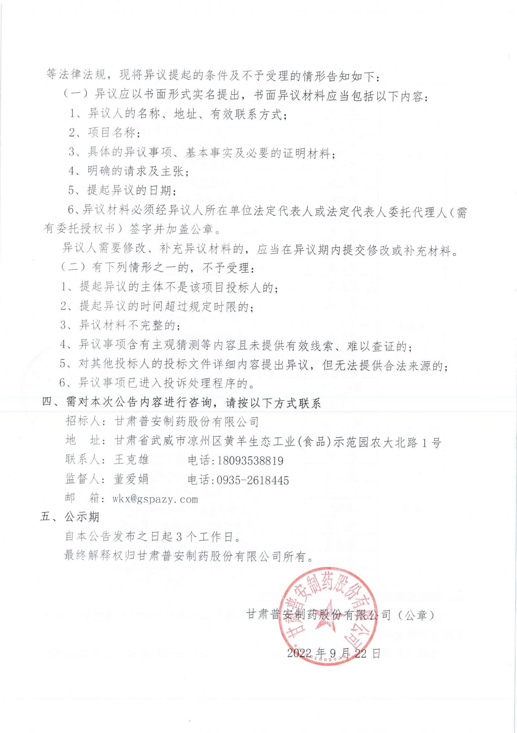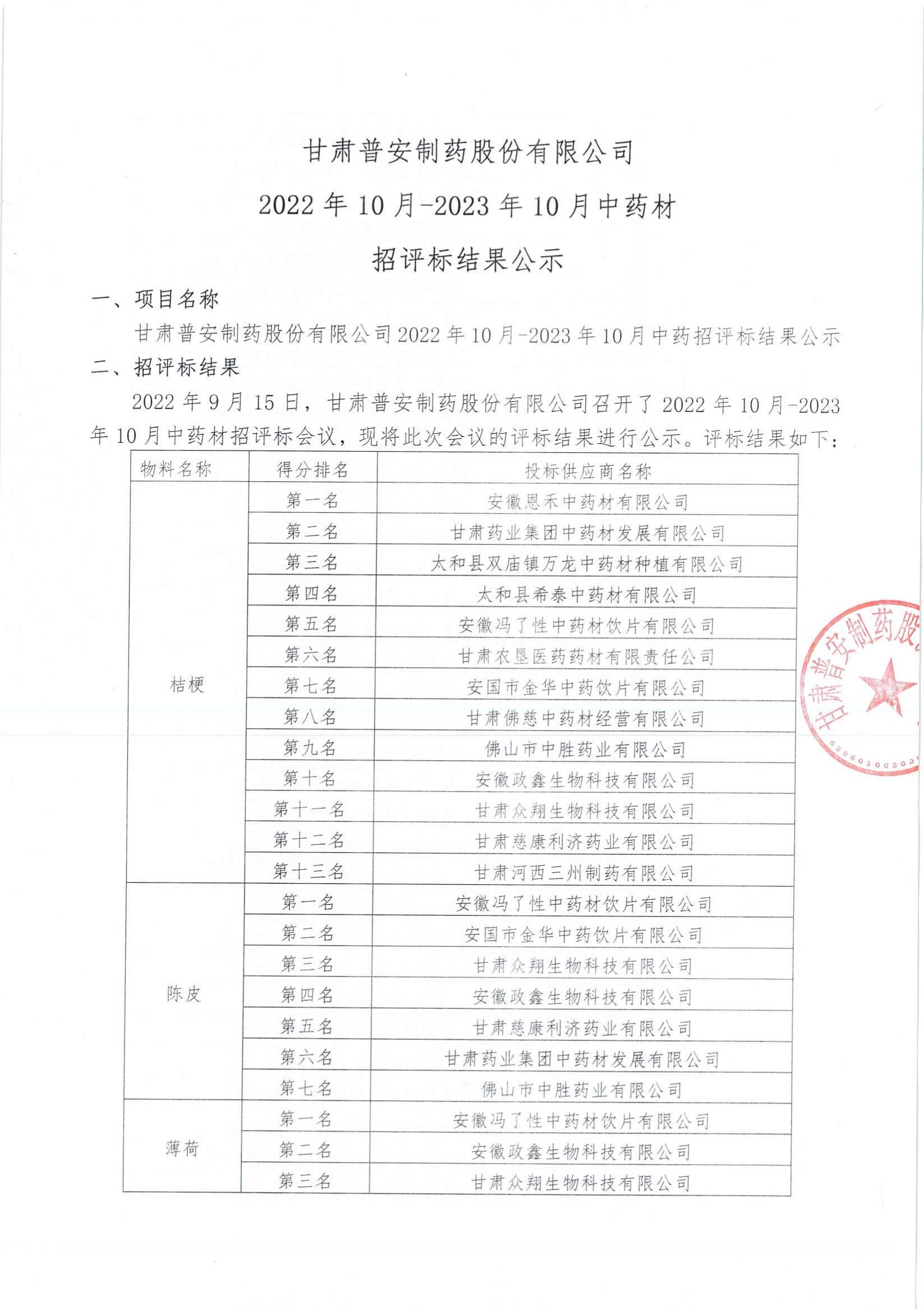 甘肅普安制藥股份有限公司2022年10月-2023年10月中藥材招評標結(jié)果公示