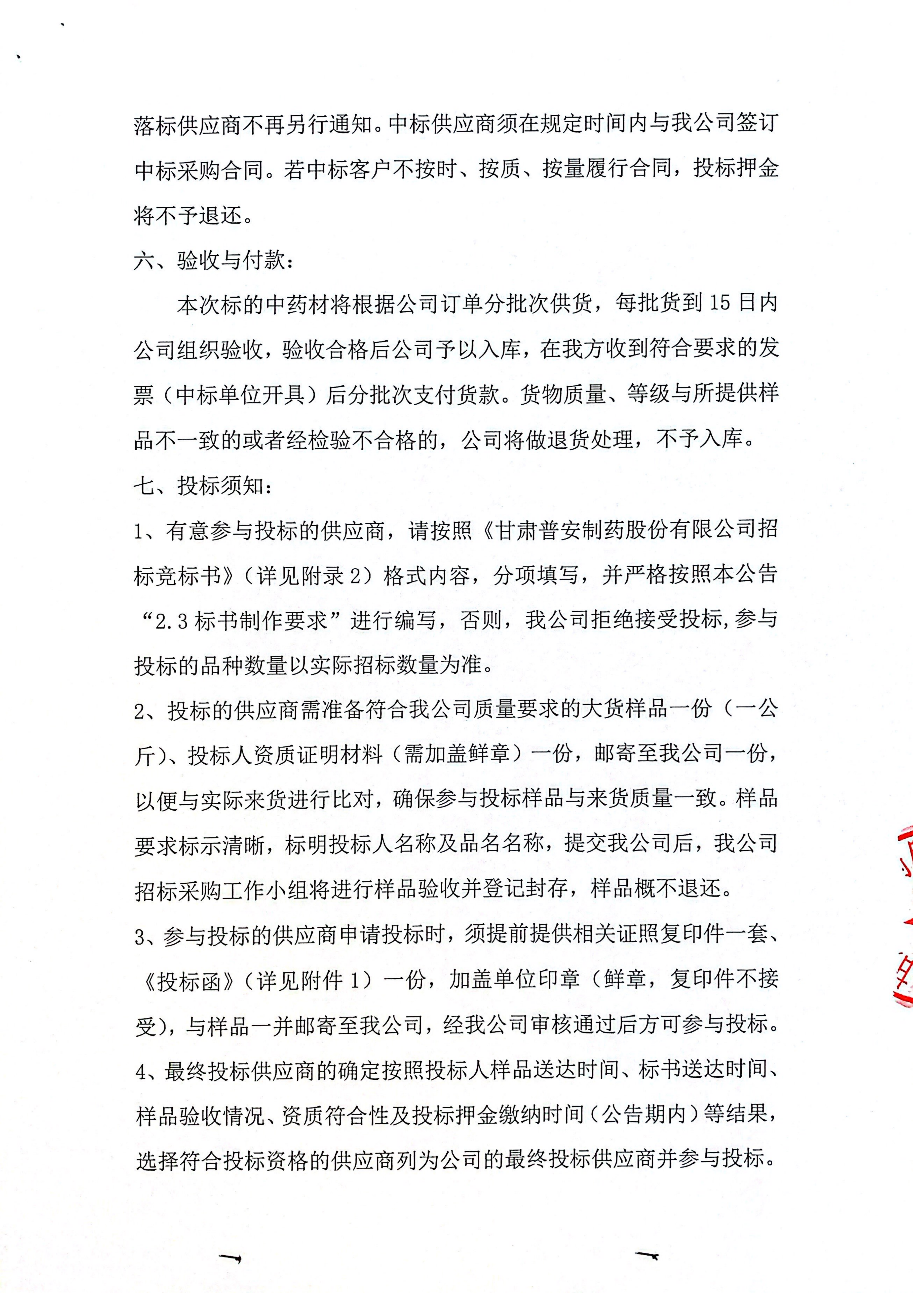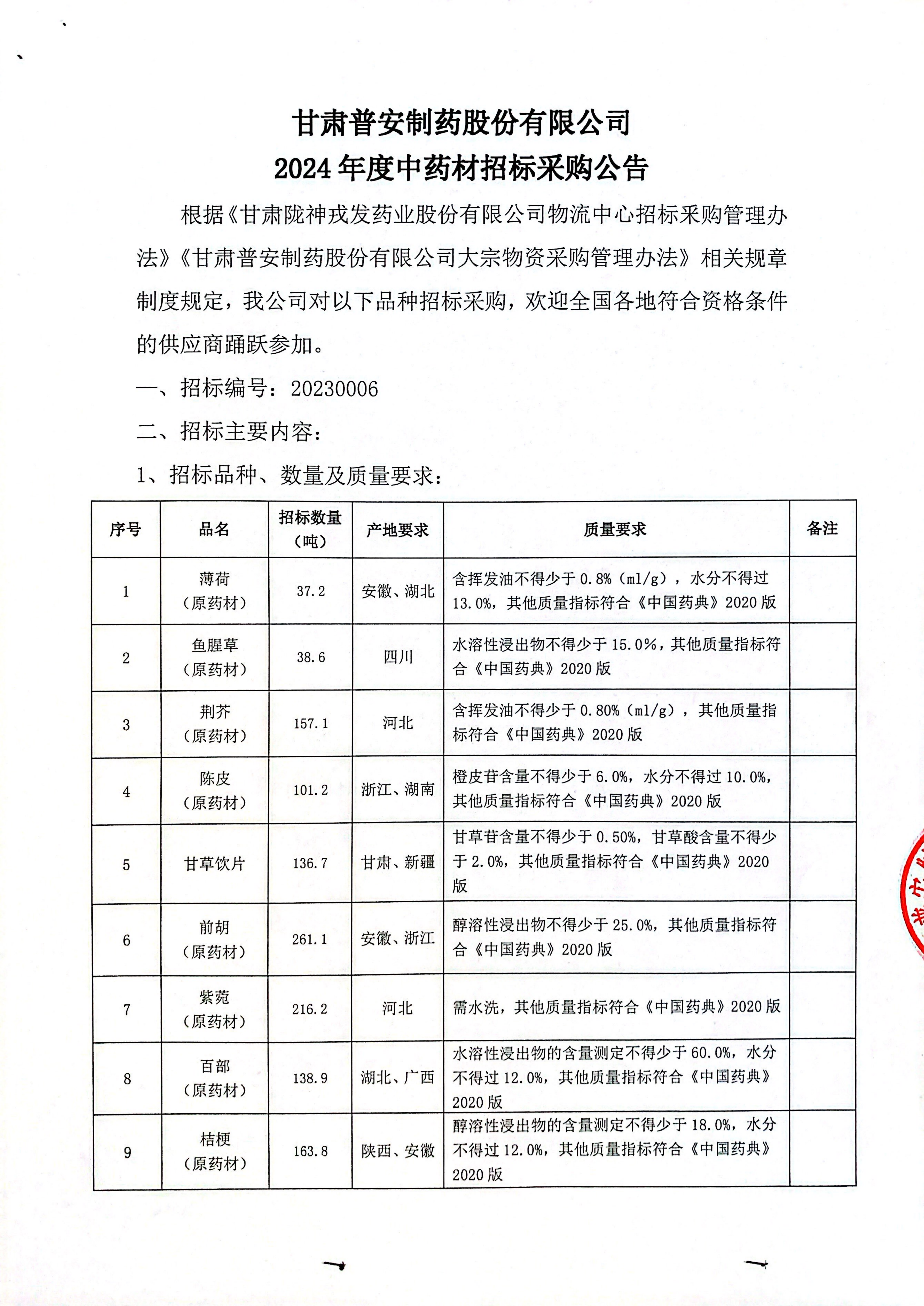 甘肅普安制藥股份有限公司2024年度中藥材招標(biāo)采購(gòu)公告