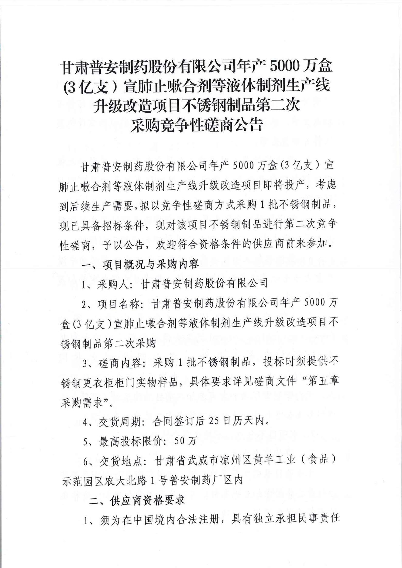 甘肅普安制藥股份有限公司年產(chǎn)5000萬(wàn)盒(3億支)宣肺止嗽合劑等液體制劑生產(chǎn)線升級(jí)改造項(xiàng)目不銹鋼制品第二次采購(gòu)競(jìng)爭(zhēng)性磋商公告
