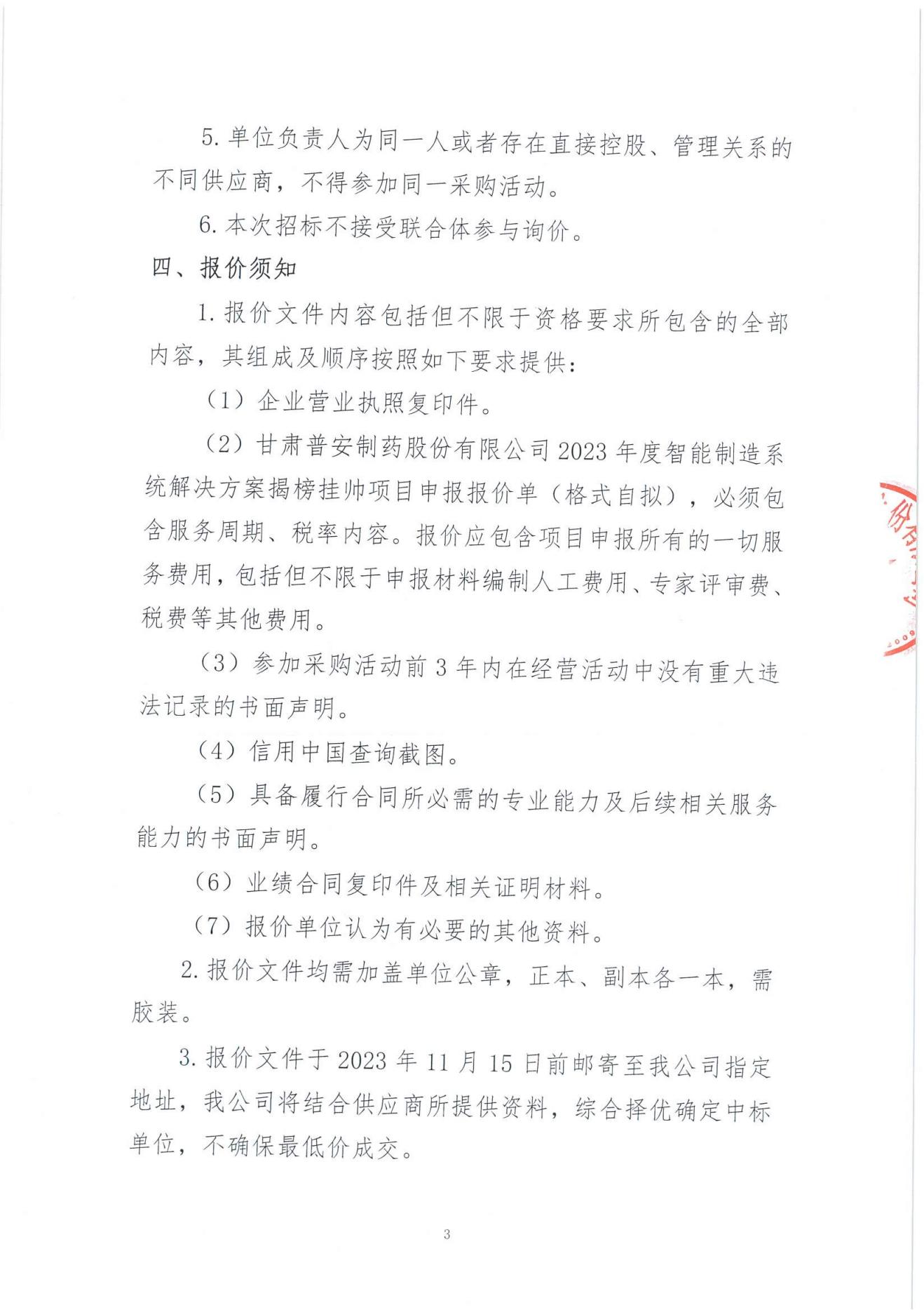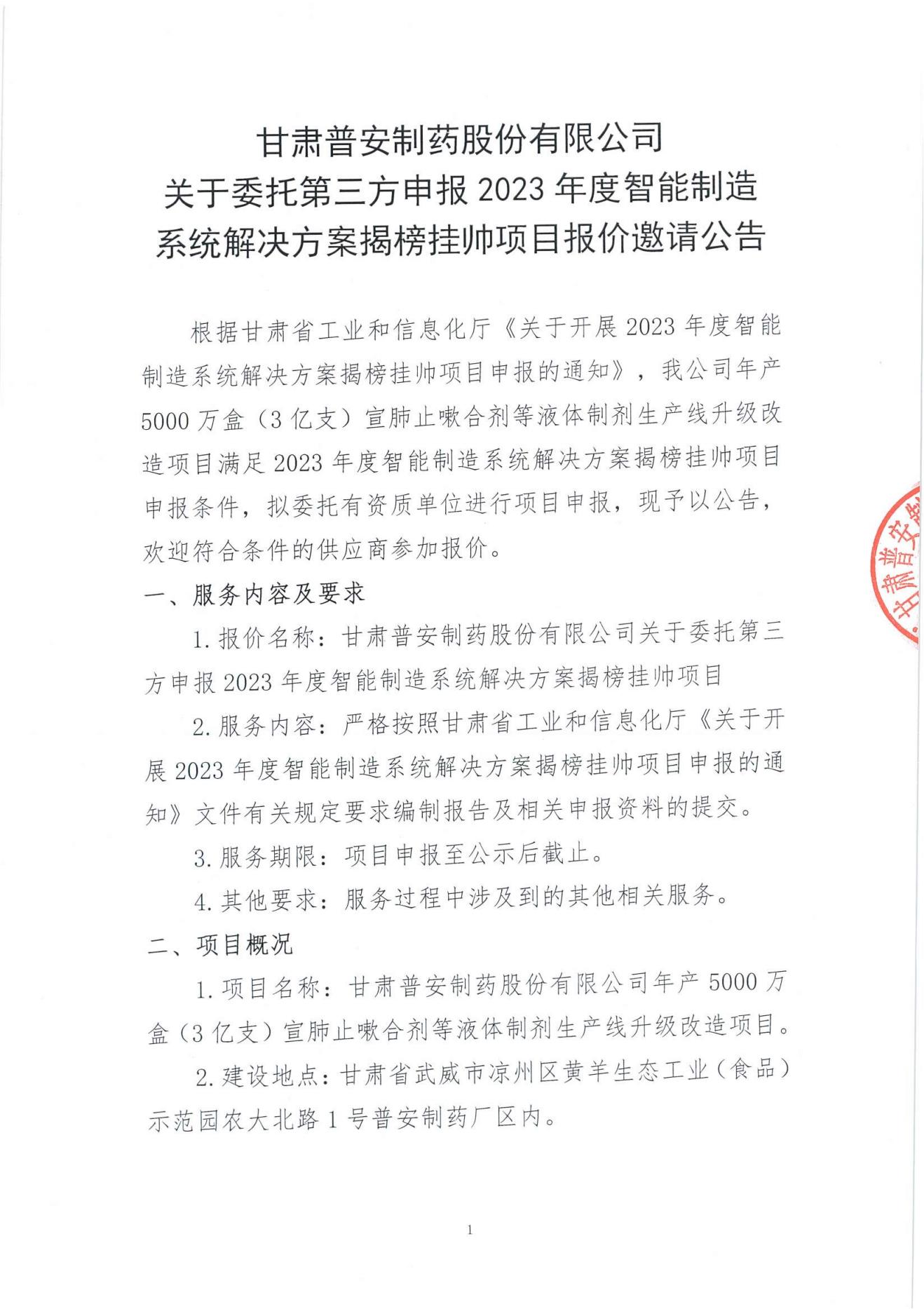 甘肅普安制藥股份有限公司關(guān)于委托第三方申報2023年度智能制造系統(tǒng)解決方案揭榜掛帥項目報價邀請公告