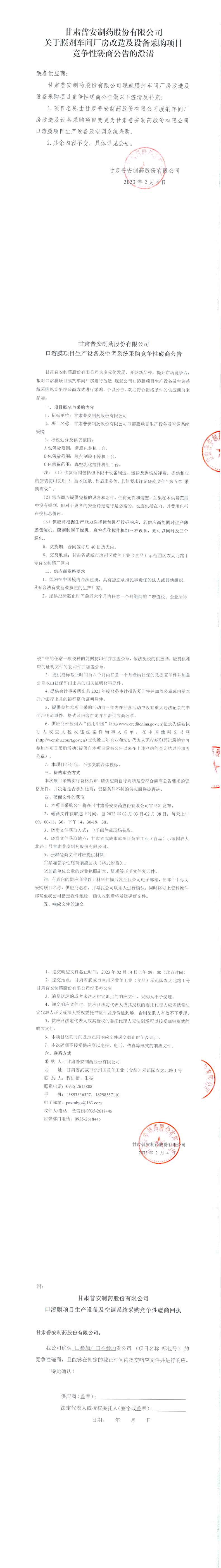 甘肅普安制藥股份有限公司關(guān)于膜劑車間廠房改造及設(shè)備采購項(xiàng)目競爭性磋商公告的澄清