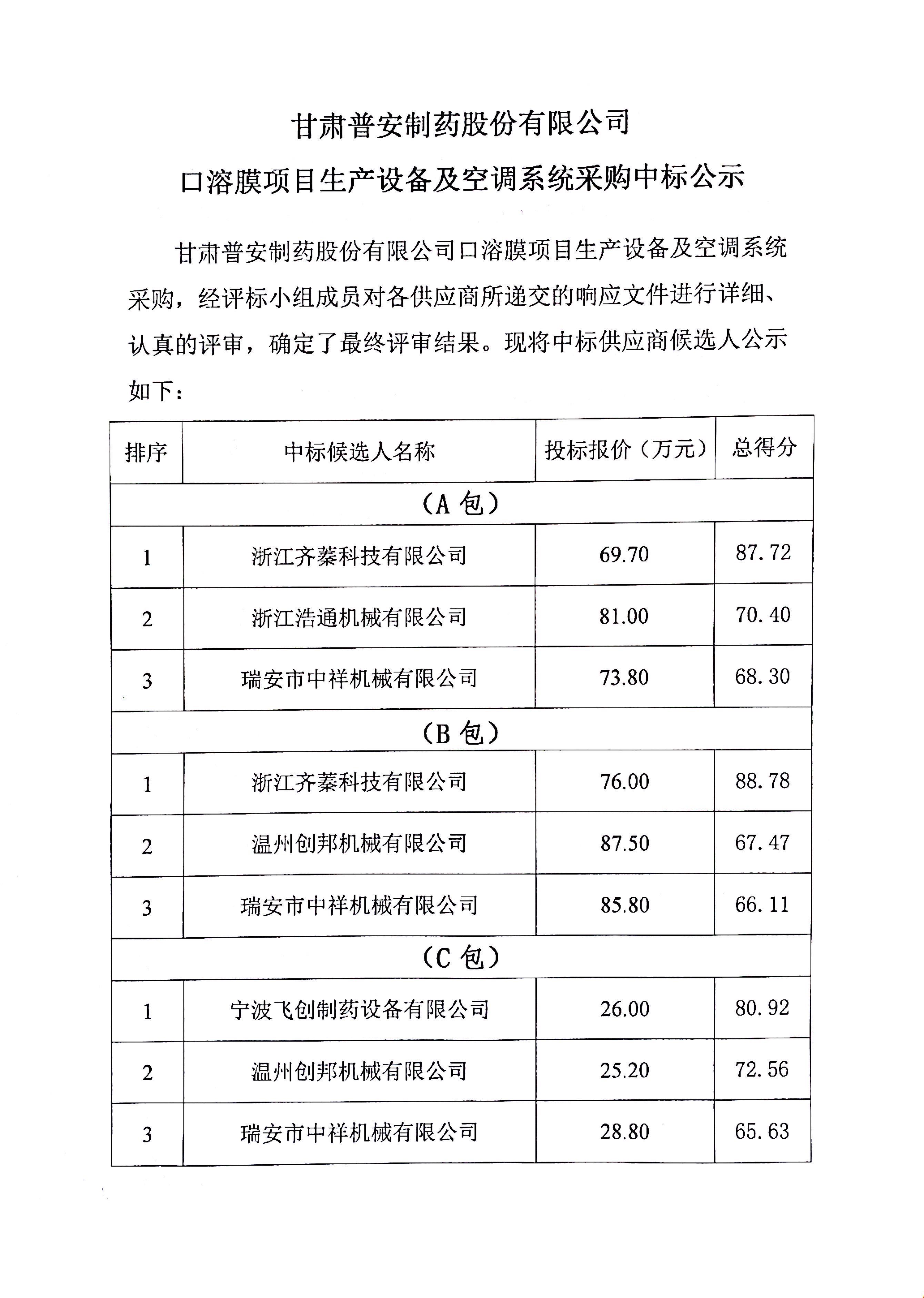甘肅普安制藥股份有限公司口溶膜項目生產(chǎn)設(shè)備及空調(diào)系統(tǒng)采購中標(biāo)公示