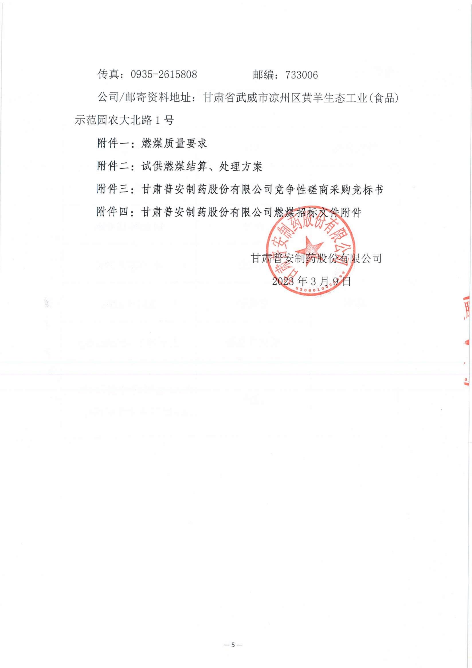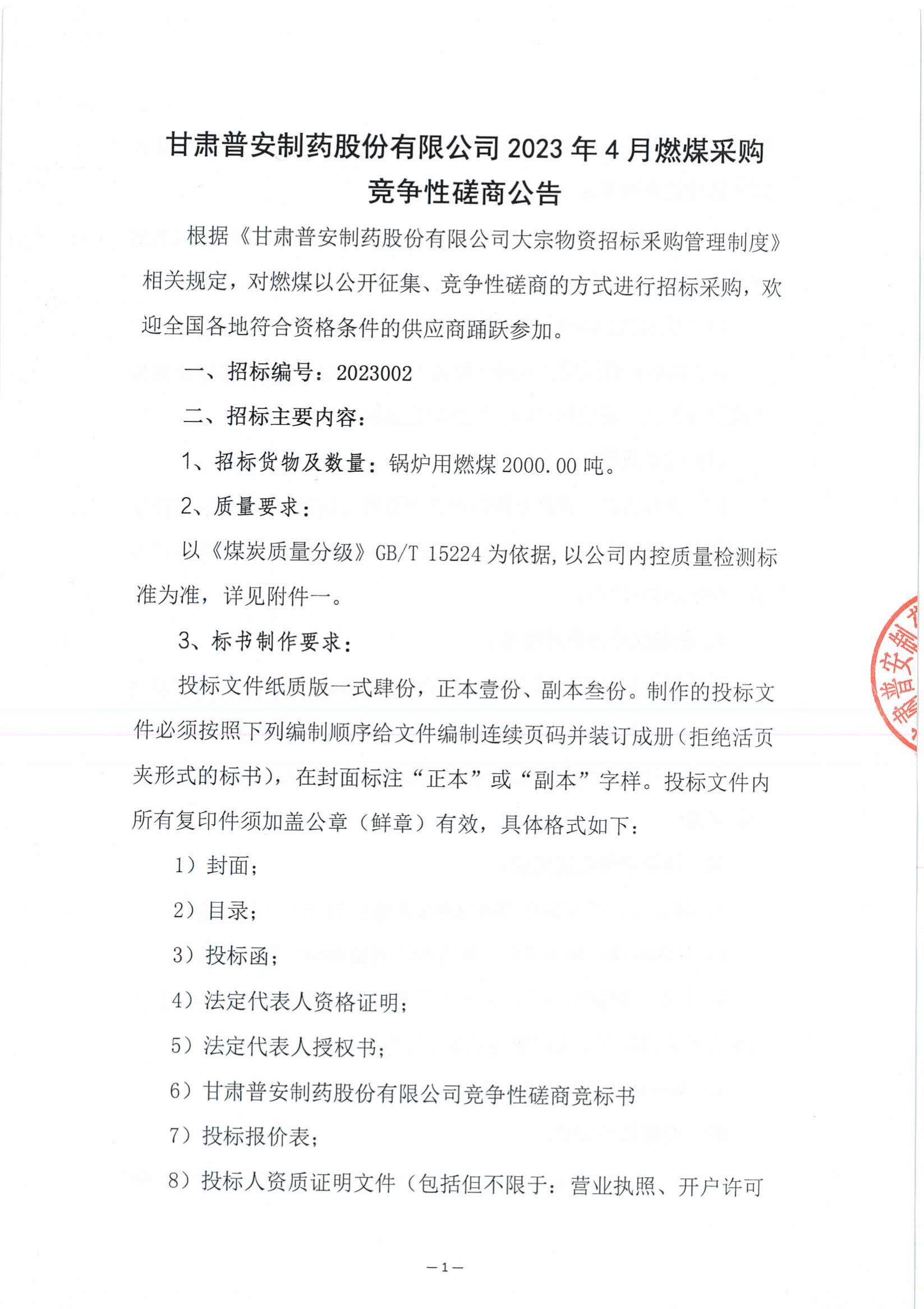 具體內(nèi)容詳見附件:甘肅普安制藥股份有限公司2023年4月燃煤采購競爭性磋商公告
