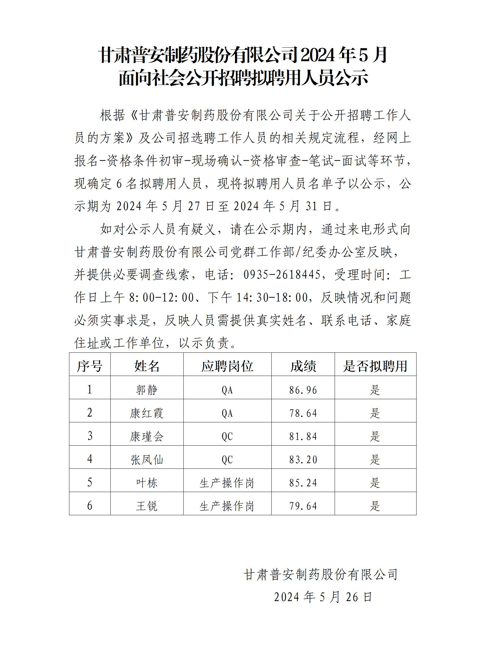 甘肅普安制藥股份有限公司2024年5月面向社會(huì)公開(kāi)招聘擬聘用人員公示