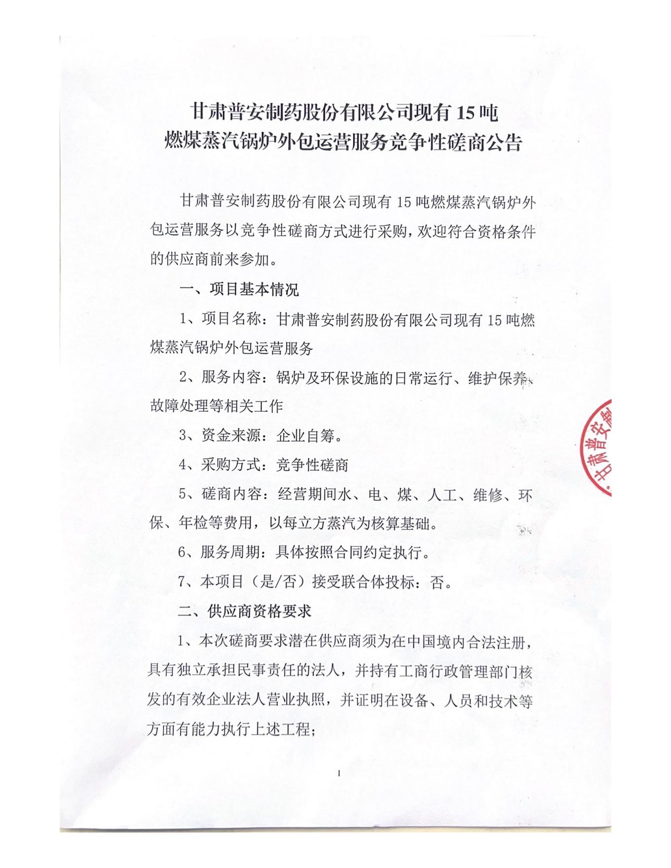 甘肅普安制藥股份有限公司現(xiàn)有15噸燃煤蒸汽鍋爐外包運(yùn)營服務(wù)競(jìng)爭(zhēng)性磋商公告