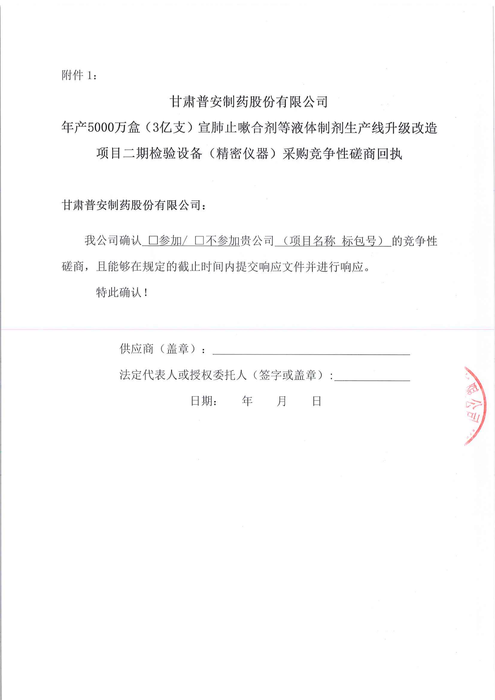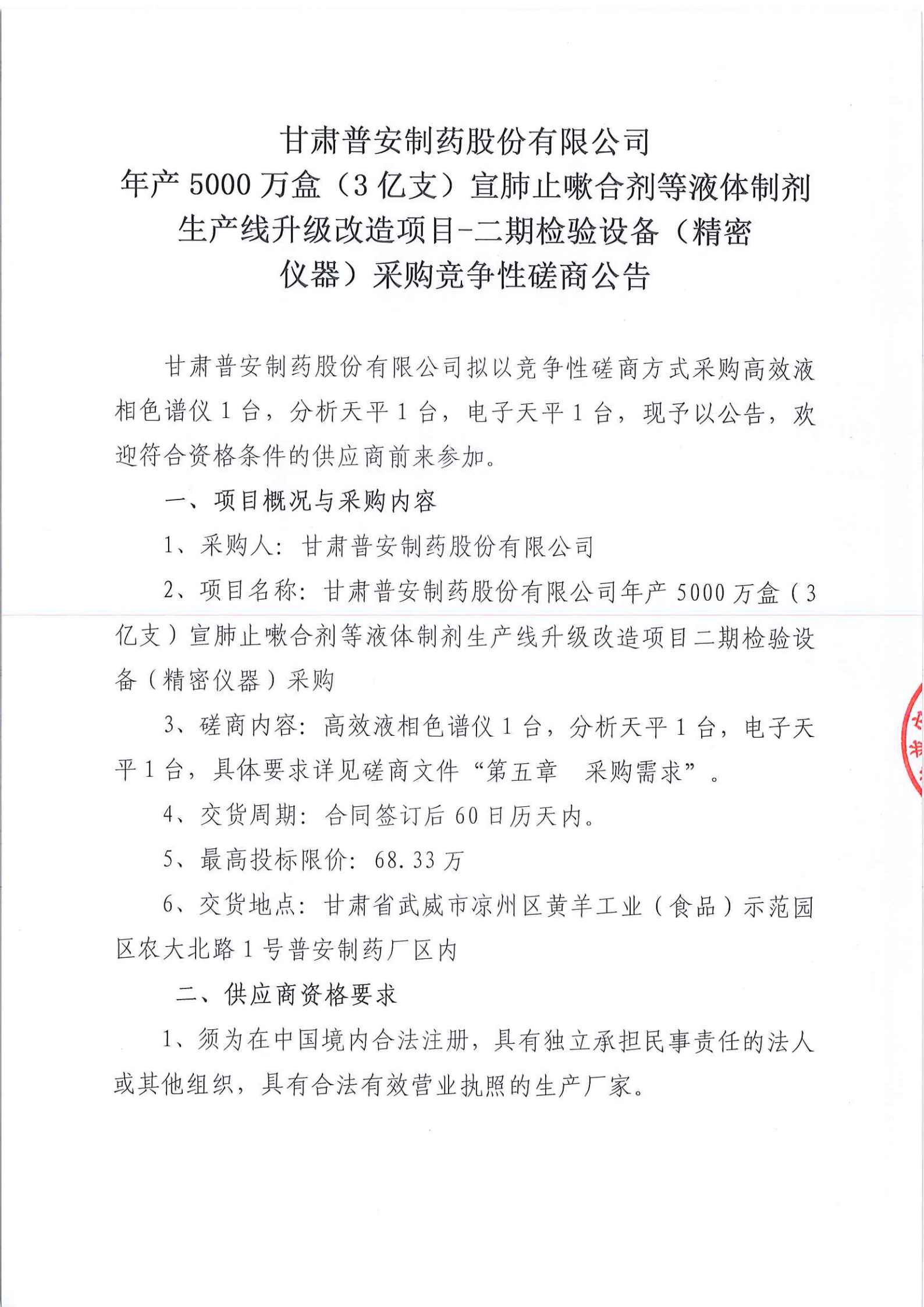 甘肅普安制藥股份有限公司年產(chǎn)5000萬盒(3億支)宣肺止嗽合劑等液體制劑生產(chǎn)線升級改造項目二期檢驗設(shè)備(精密儀器)采購競爭性磋商公告