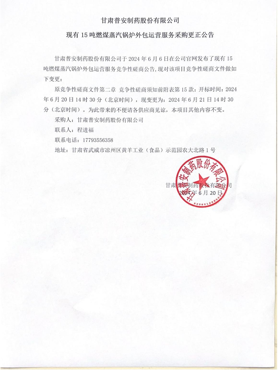 甘肅普安制藥股份有限公司現(xiàn)有15噸燃煤蒸汽鍋爐外包運(yùn)營服務(wù)采購更正公告