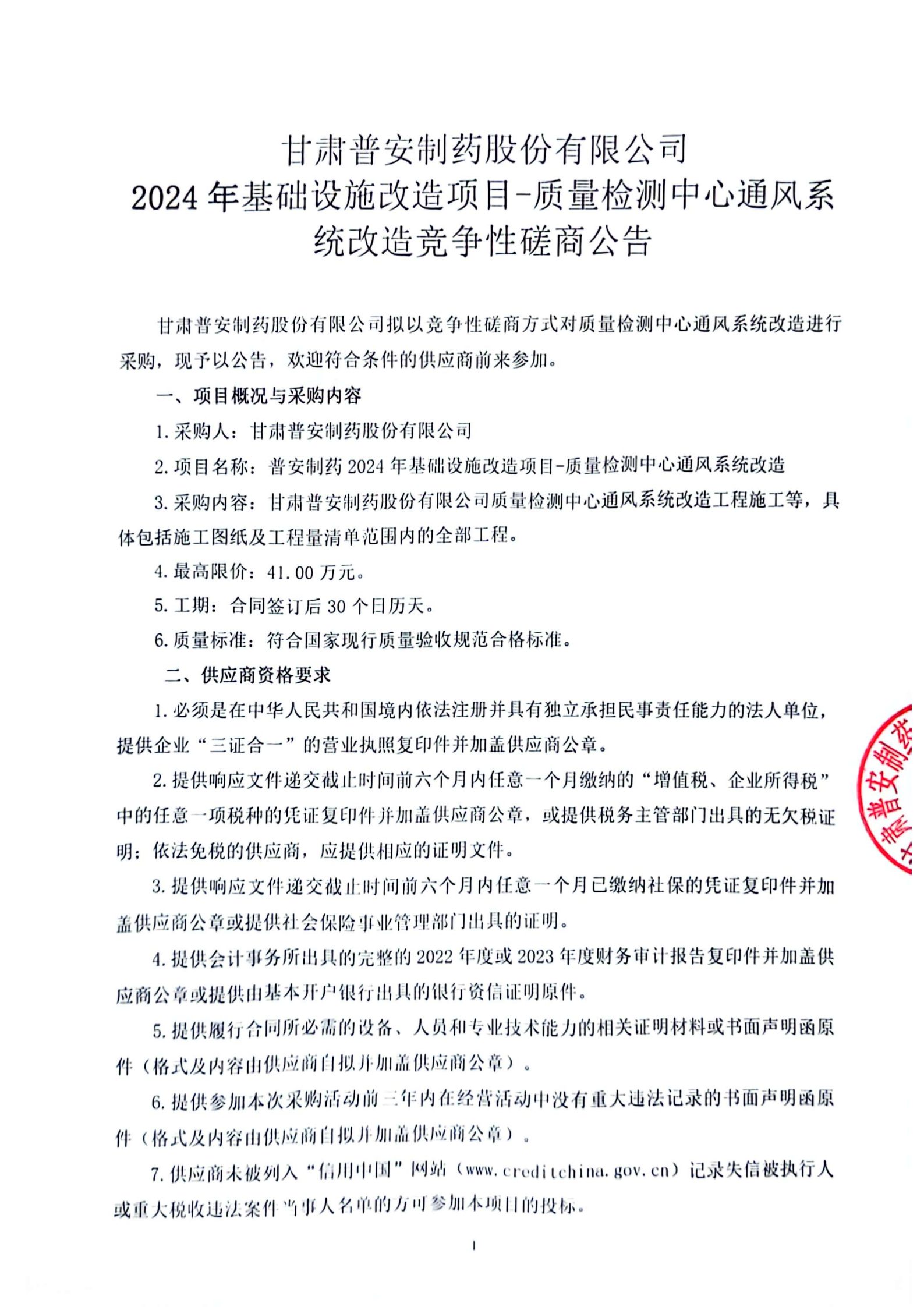 甘肅普安制藥股份有限公司2024年基礎(chǔ)設(shè)施改造項(xiàng)目-質(zhì)量檢測中心通風(fēng)系統(tǒng)改造競爭性磋商公告