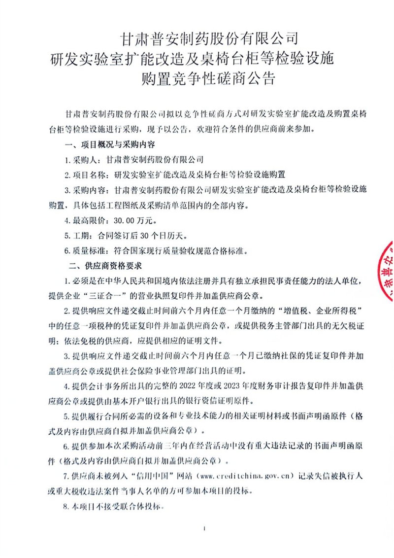 甘肅普安制藥股份有限公司研發(fā)實驗室擴(kuò)能改造及桌椅臺柜等檢驗設(shè)施購置競爭性磋商公告