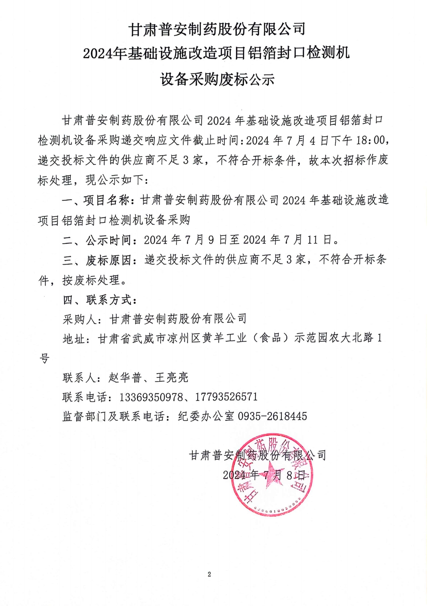 甘肅普安制藥股份有限公司2024年基礎(chǔ)設(shè)施改造項目鋁箔封口機設(shè)備采購廢標(biāo)公示