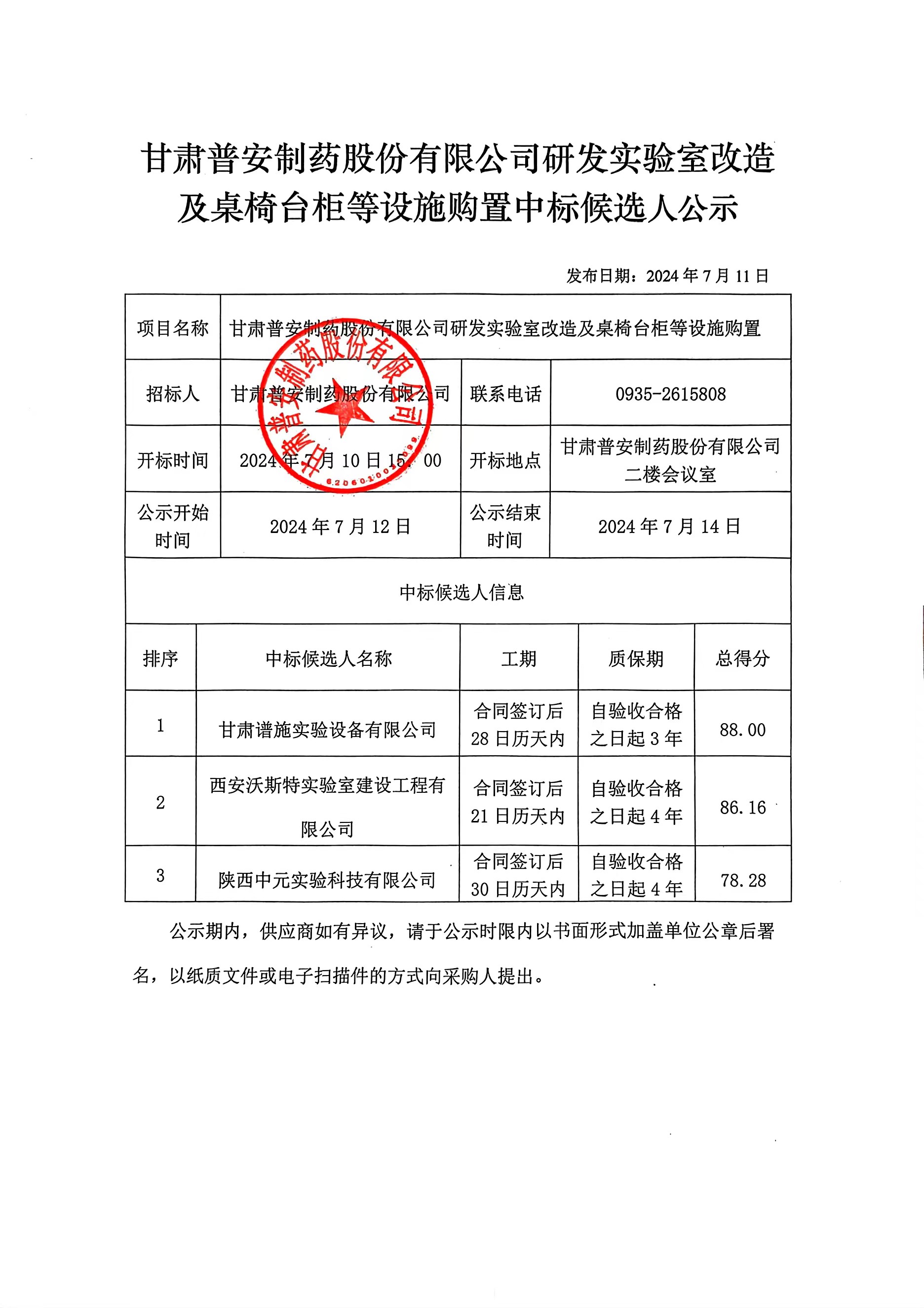 甘肅普安制藥股份有限公司研發(fā)實(shí)驗(yàn)室改造及桌椅臺(tái)柜等設(shè)施購(gòu)置中標(biāo)候選人公示