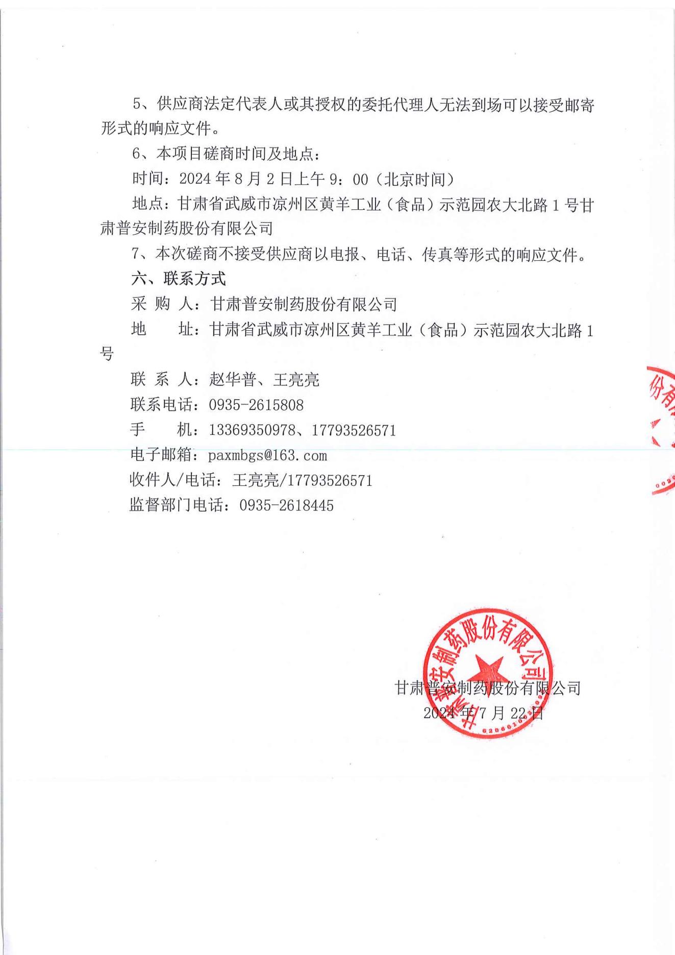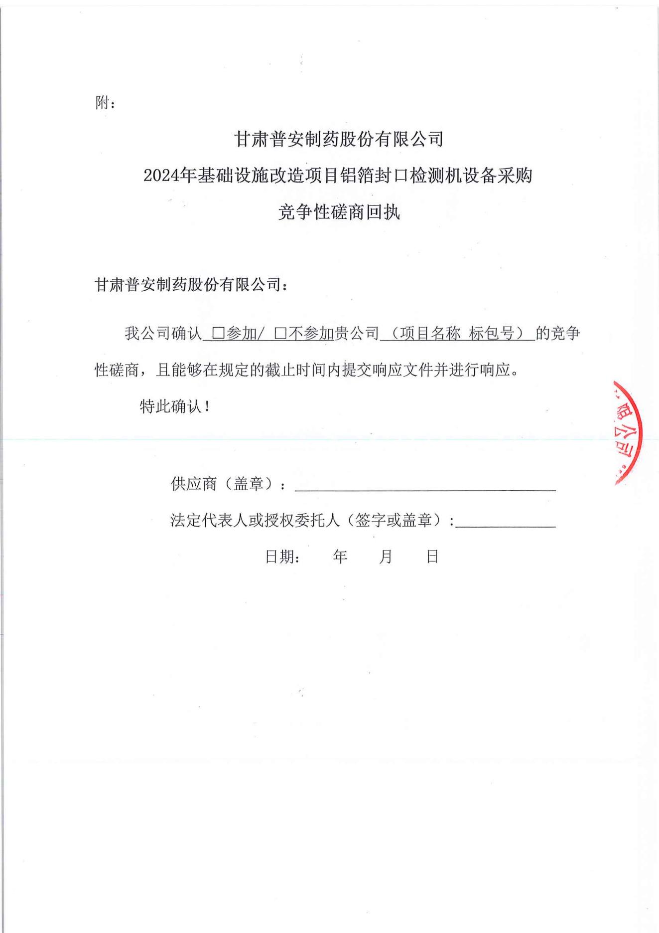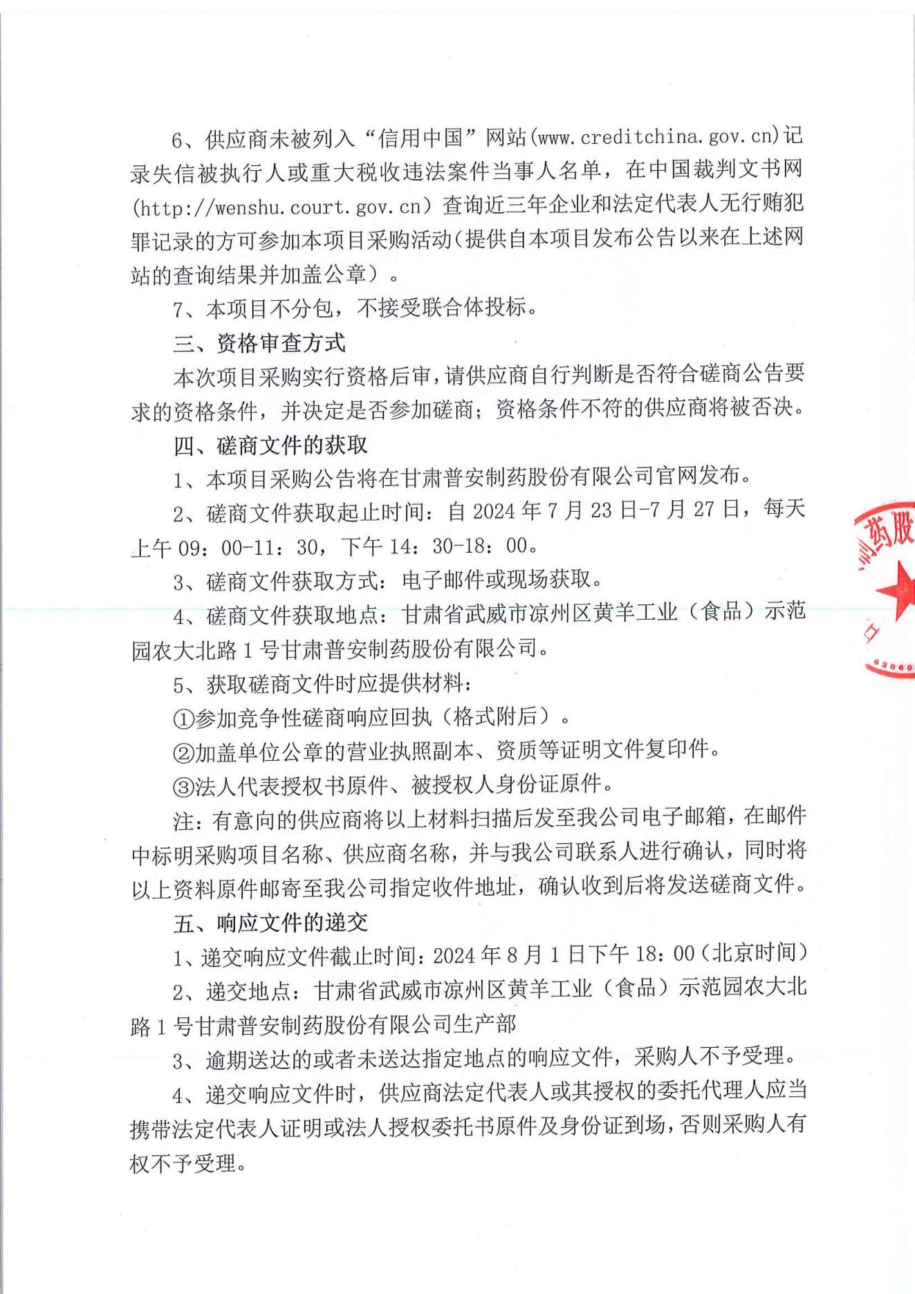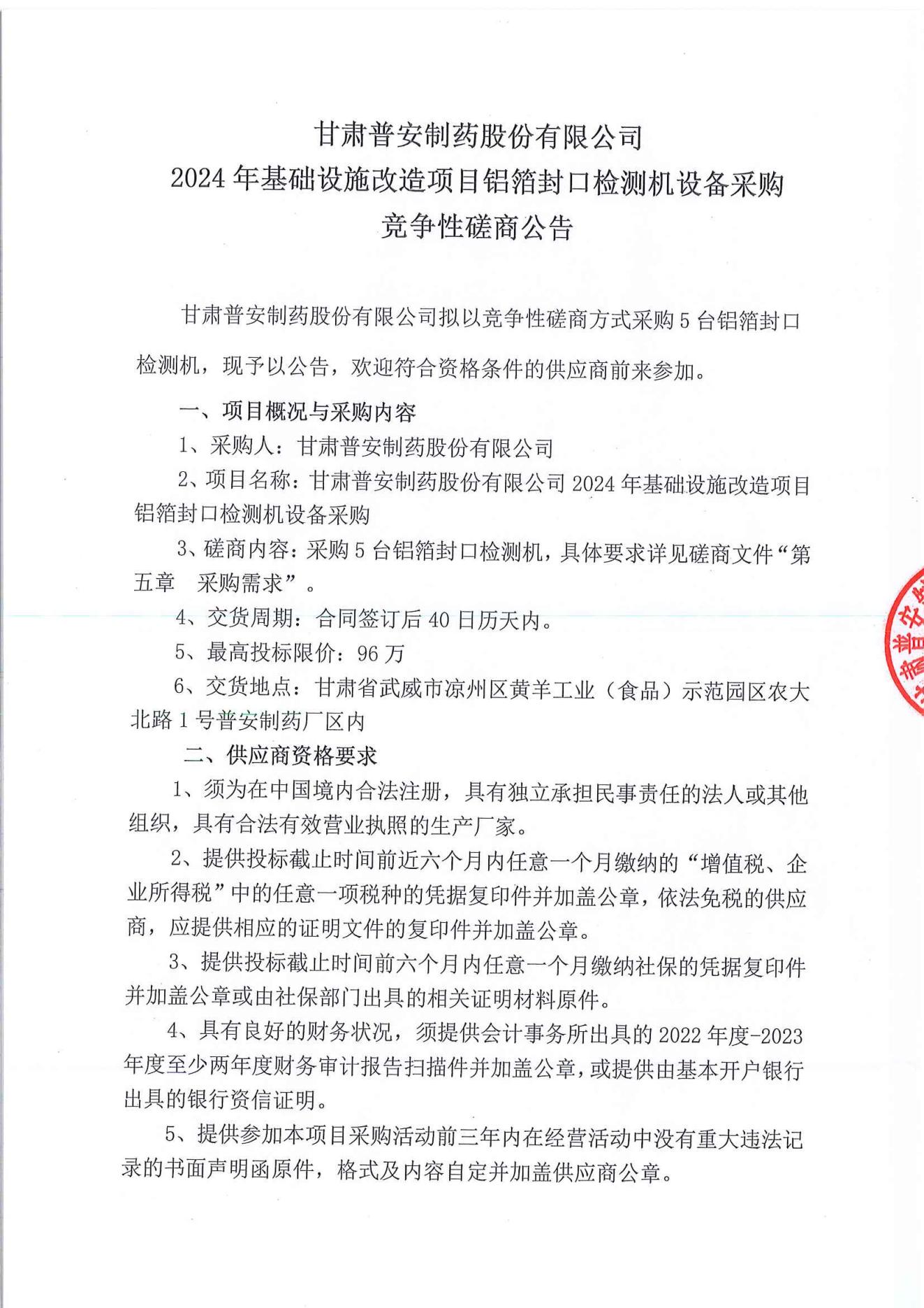甘肅普安制藥股份有限公司2024年基礎(chǔ)設(shè)施改造項目鋁封口檢測機(jī)設(shè)備采購競爭性磋商公告