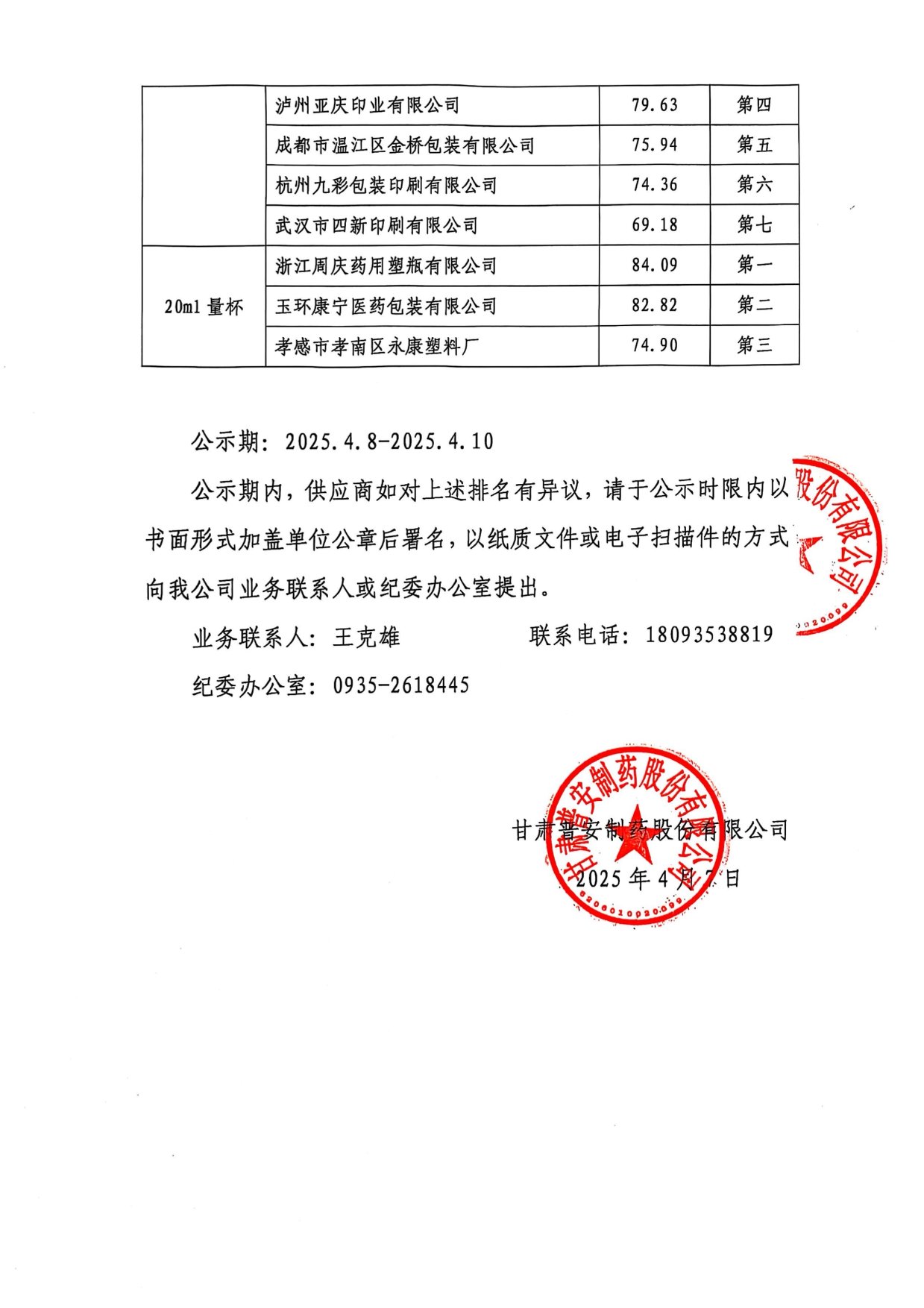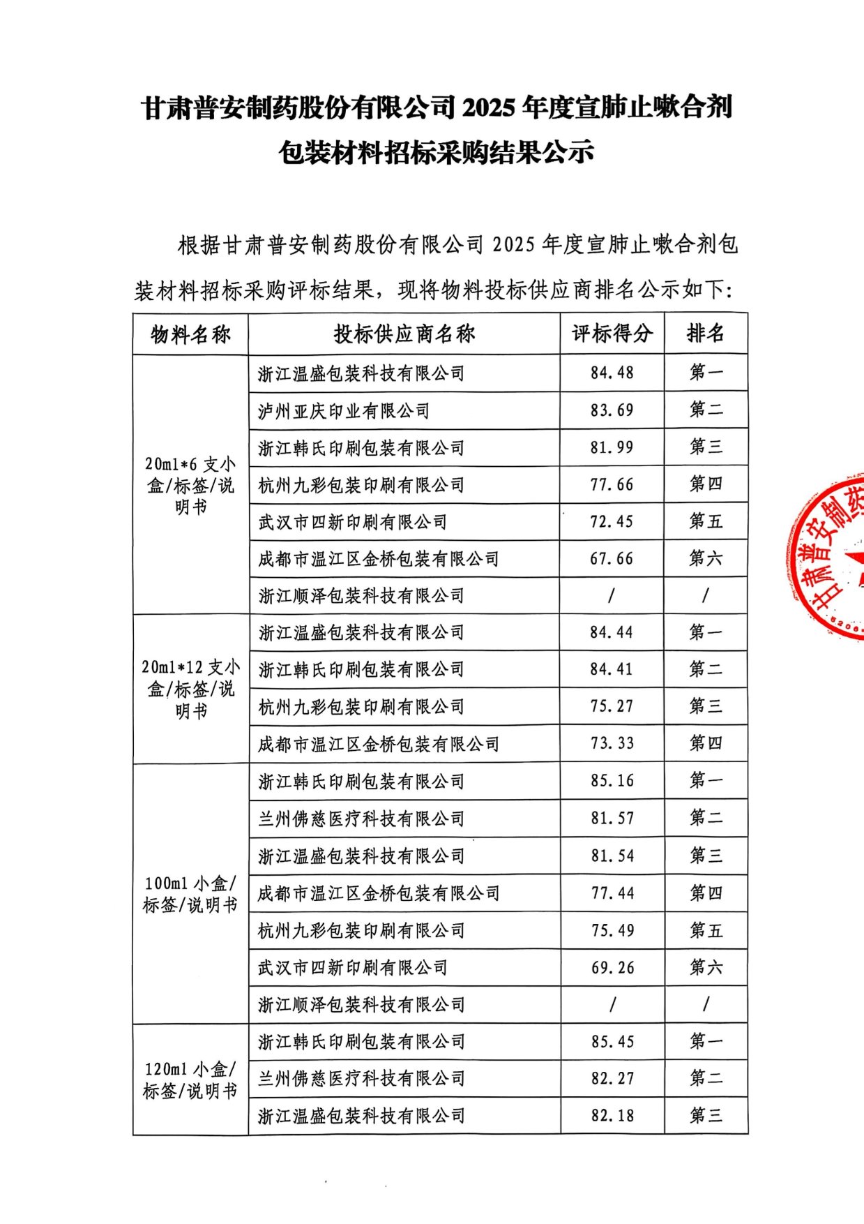 甘肅普安制藥股份有限公司2025年宣肺止嗽合劑包裝材料招標(biāo)采購結(jié)果公示