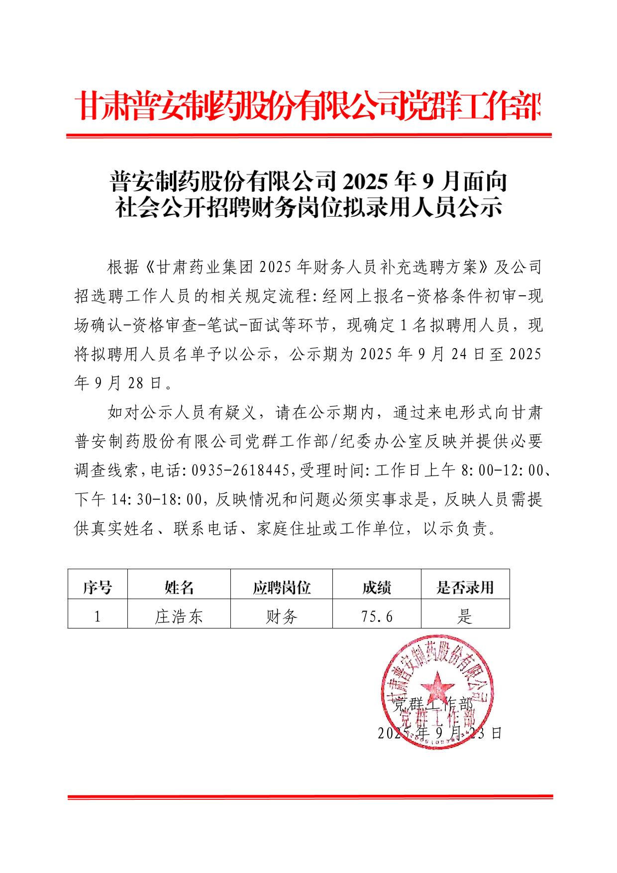 普安制藥股份有限公司2025年9月面向社會(huì)公開招聘財(cái)務(wù)崗位擬錄用人員公示
