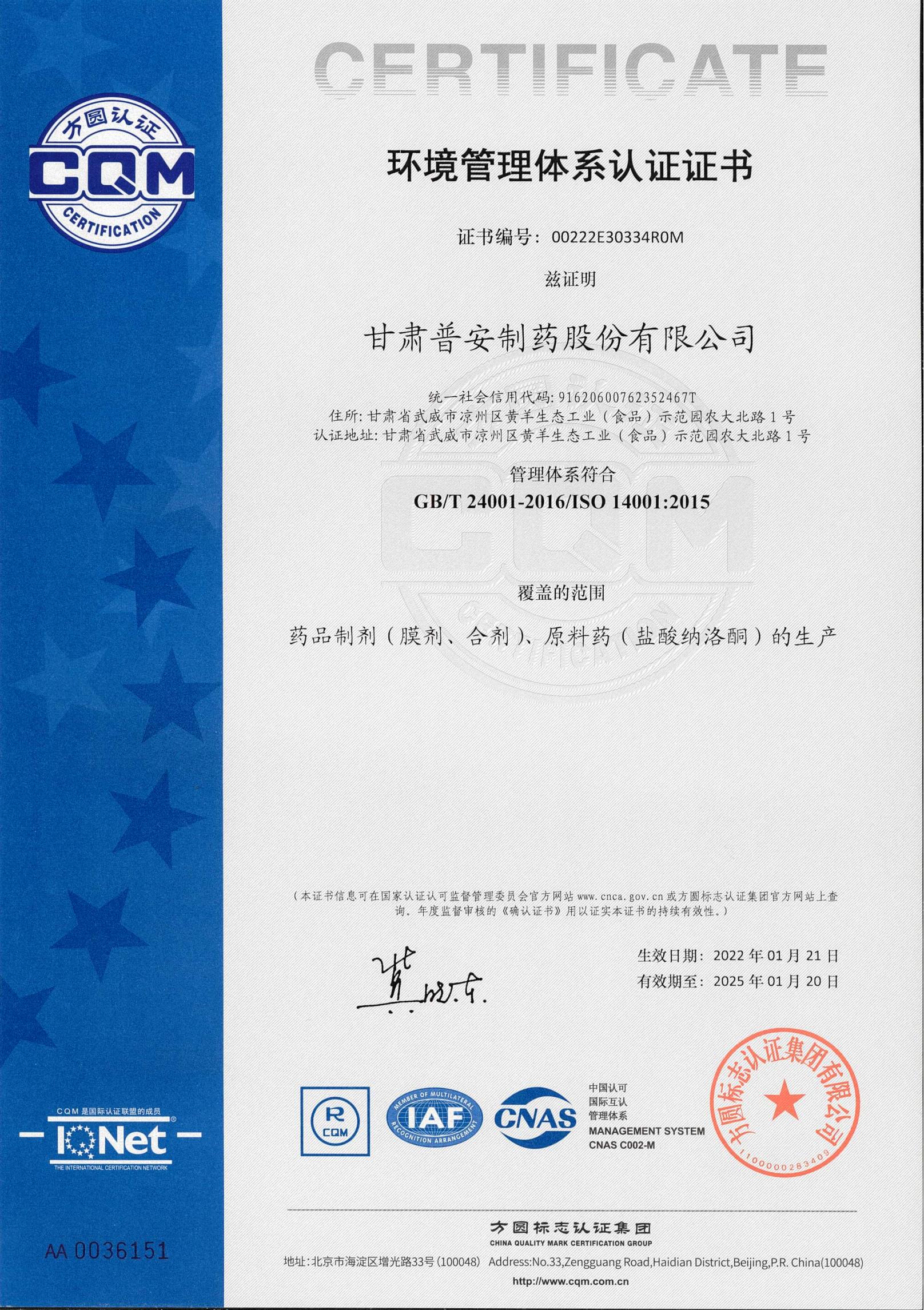 環(huán)境管理體系認證證書