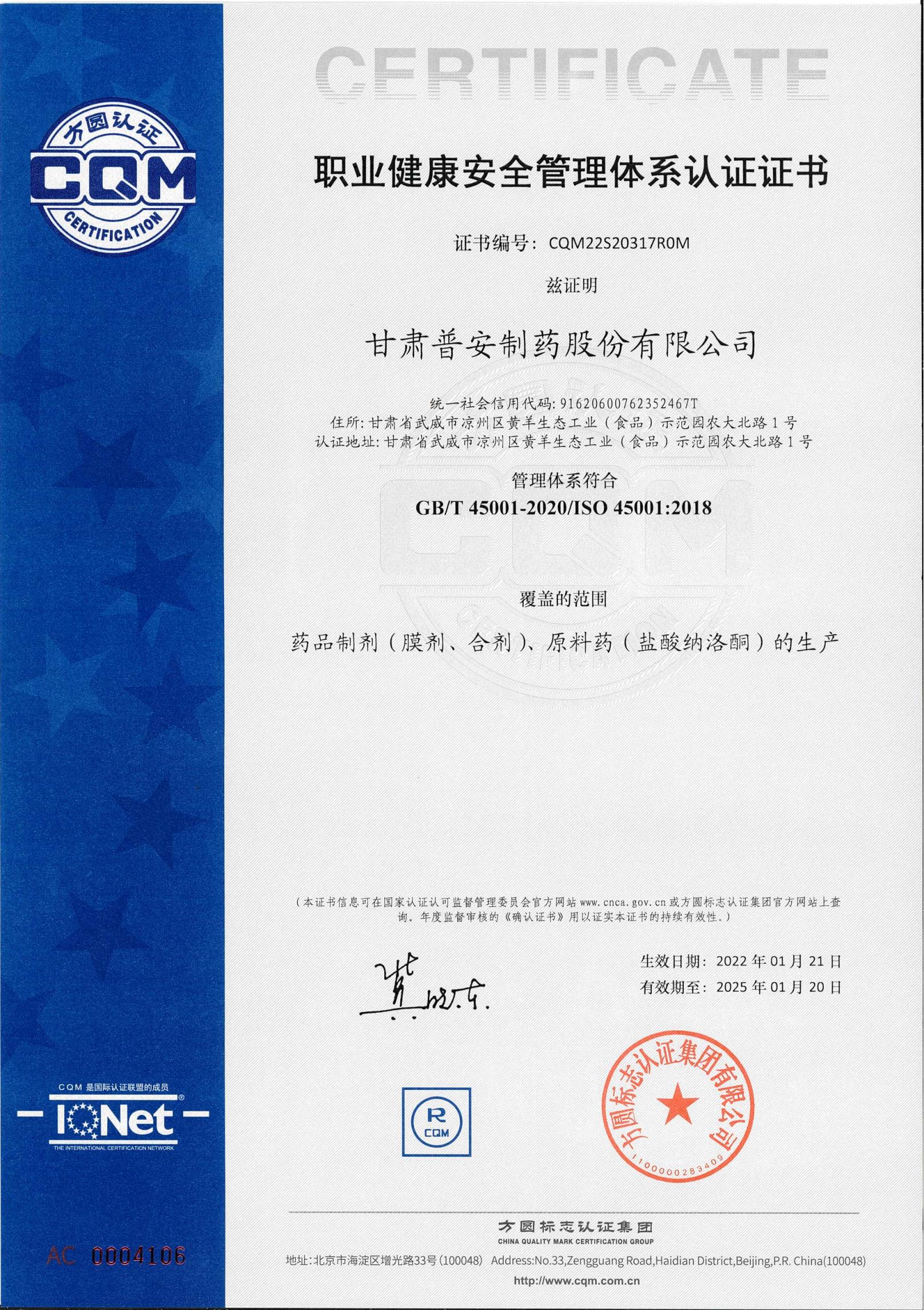 職業(yè)健康安全管理體系認證證書