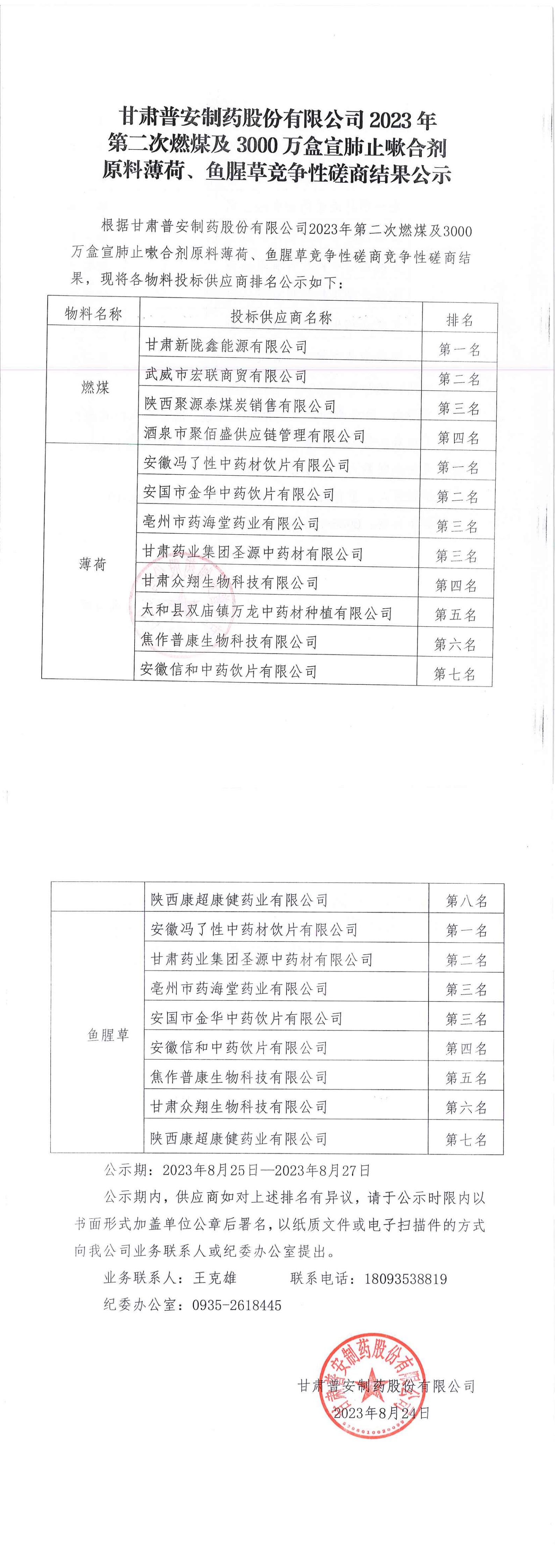 甘肅普安制藥股份有限公司2023年第二次燃煤及3000萬盒宣肺止嗽合劑原料薄荷、魚腥草競爭性磋商結(jié)果公示